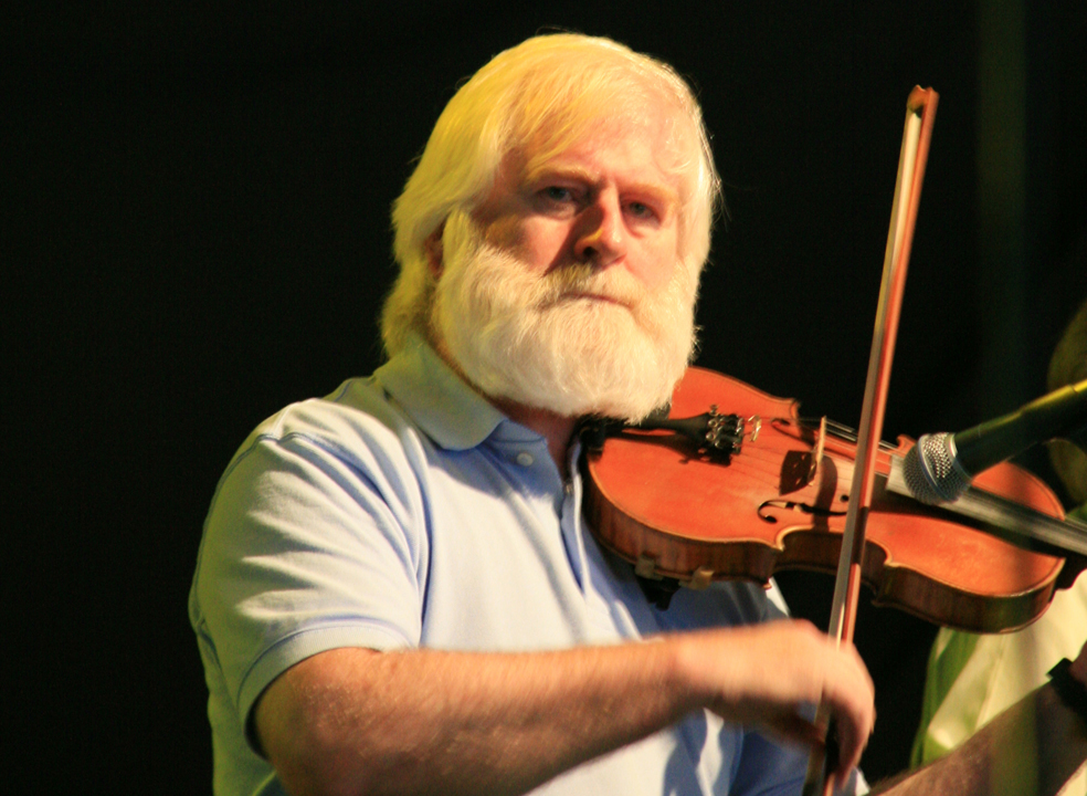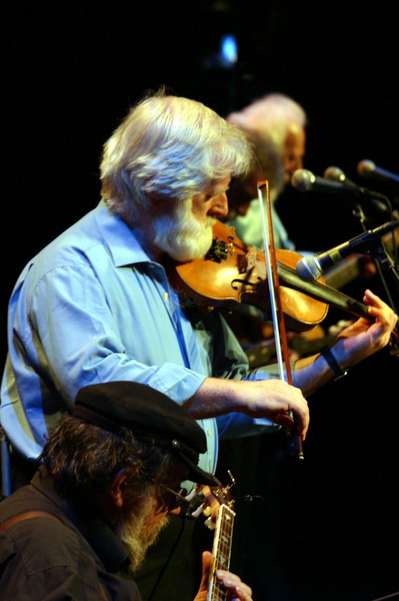 • Download Foto: Ein älterer Mann mit weißem Bart spielt Geige auf einer Bühne, trägt ein hellblaues Hemd und steht vor einem dunklen Hintergrund.John Sheahan