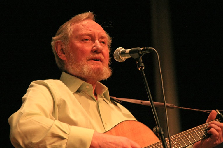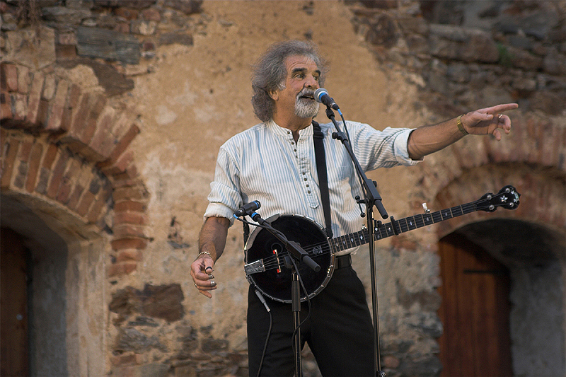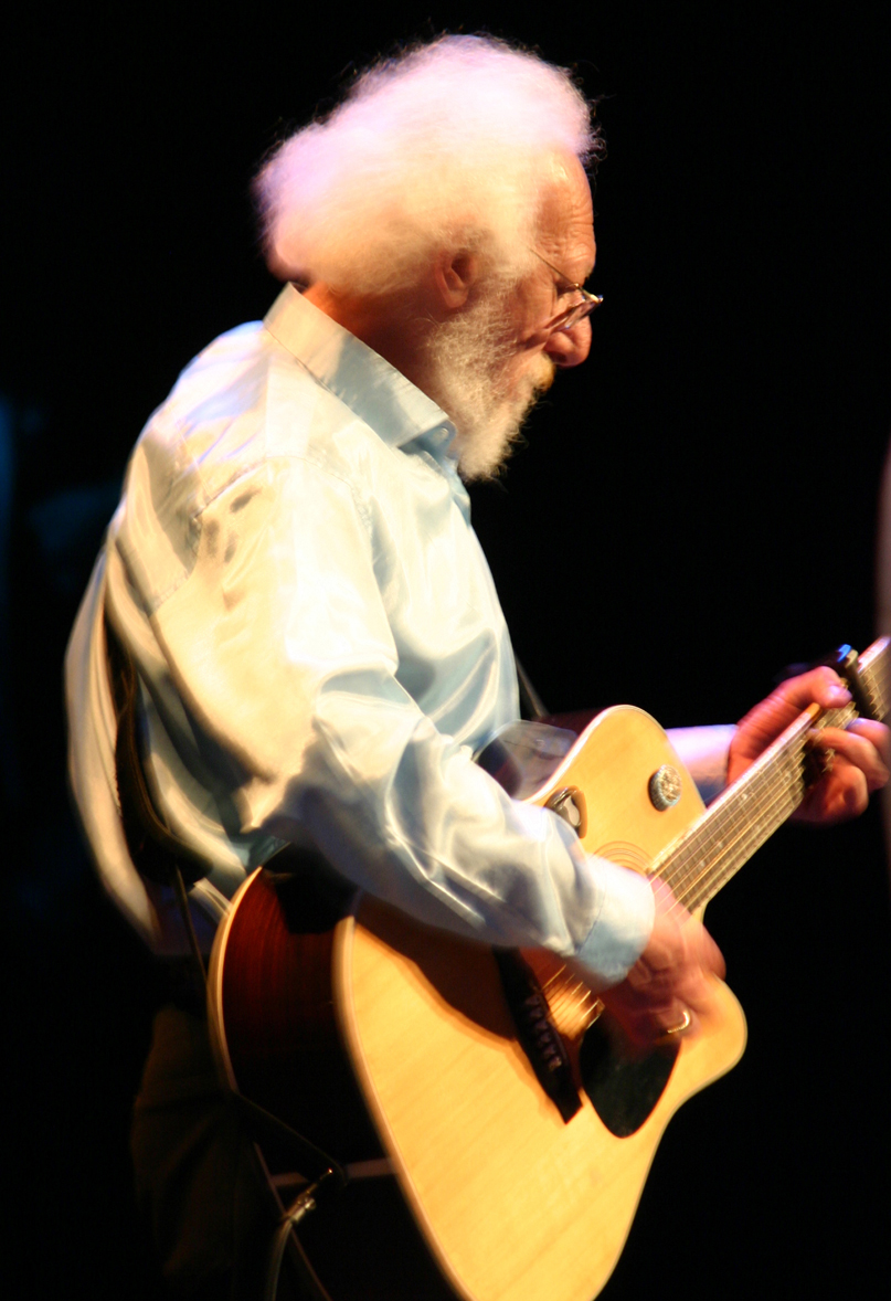 • Download Foto: Ein älterer Mann mit Bart spielt Gitarre und singt in ein Mikrofon auf einer Bühne. Er trägt ein helles Hemd.Seán Cannon