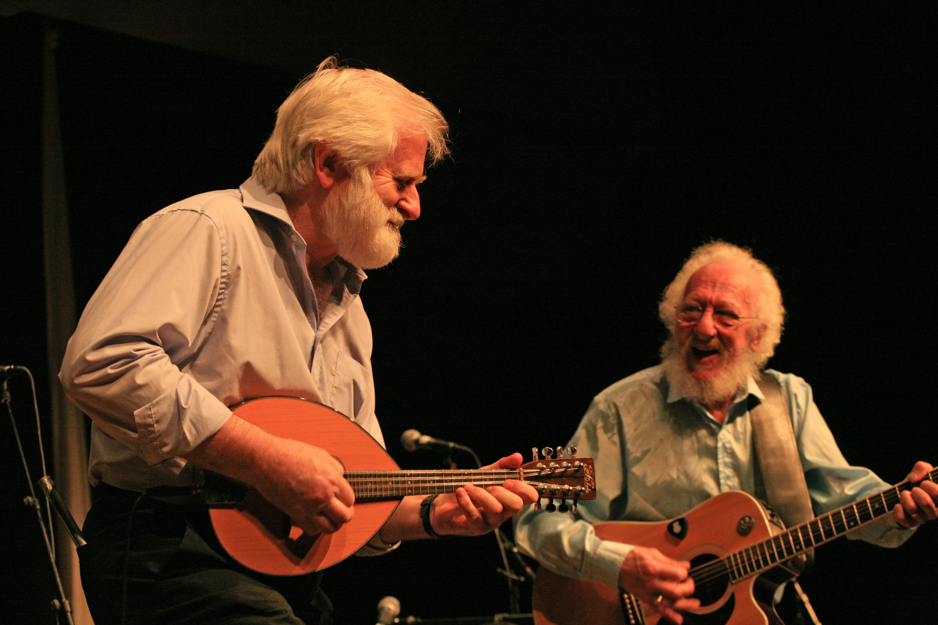 • Download Foto: Zwei ältere Männer mit weißen Bärten spielen Gitarre und Mandoline auf einer Bühne, wirken zufrieden und konzentriert.Eamonn Campbell / John Sheahan