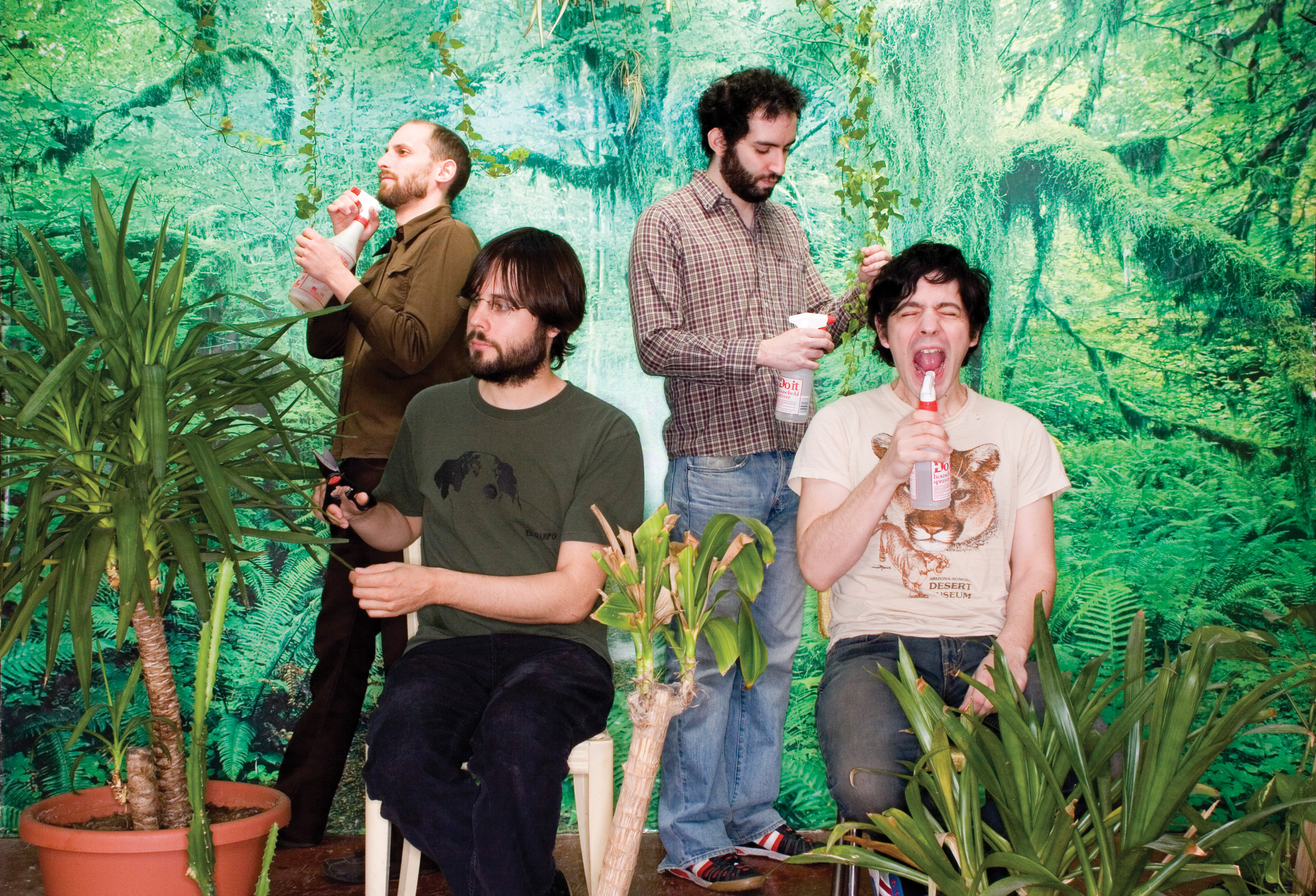 • Download Foto: Vier Männer sitzen und stehen umgeben von Topfpflanzen vor einem grünen, pflanzenreichen Hintergrund.