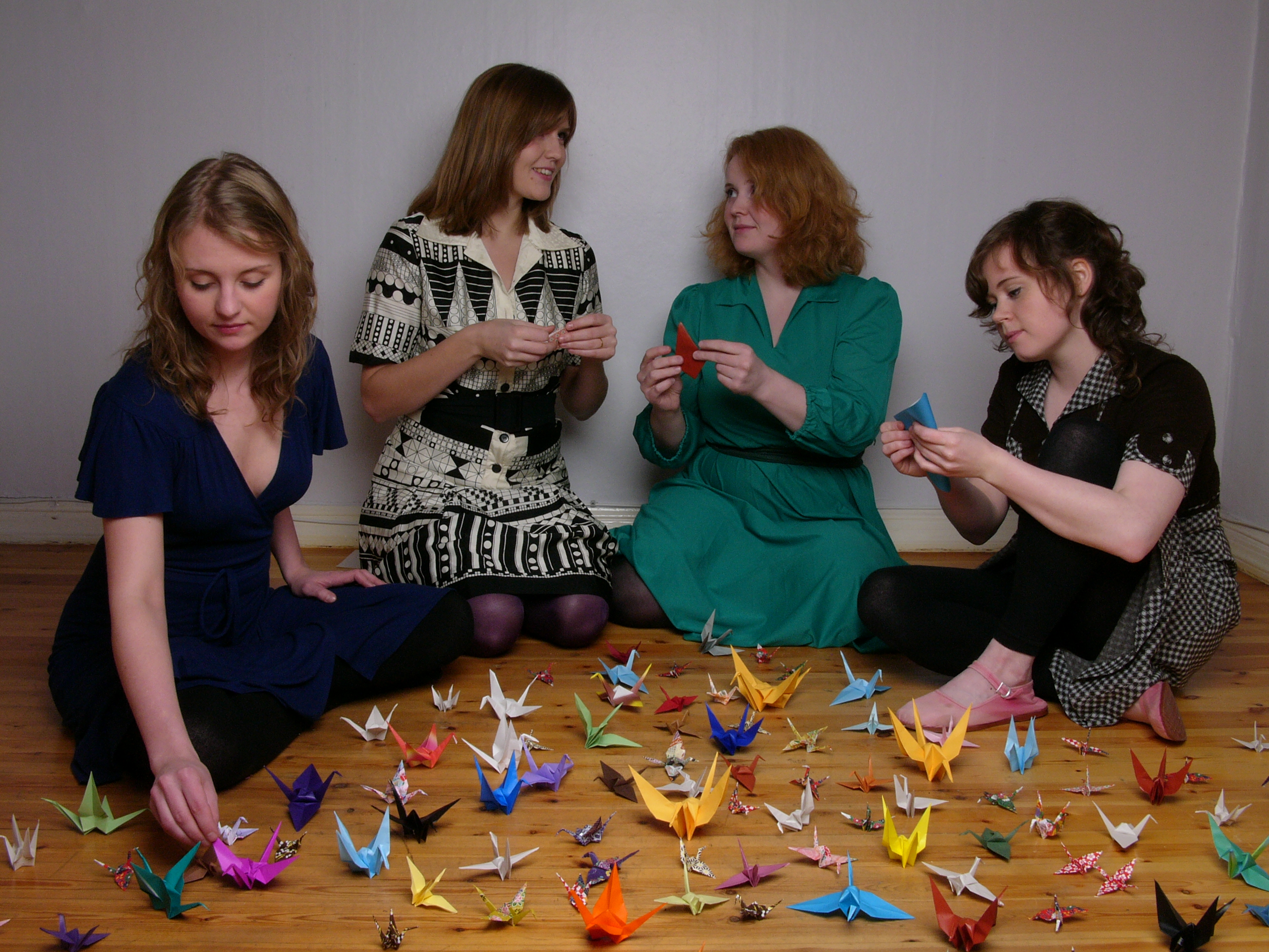 • Download Foto: Vier Frauen sitzen auf dem Boden, umgeben von bunten Origami-Figuren, und falten Papierkreaturen.
