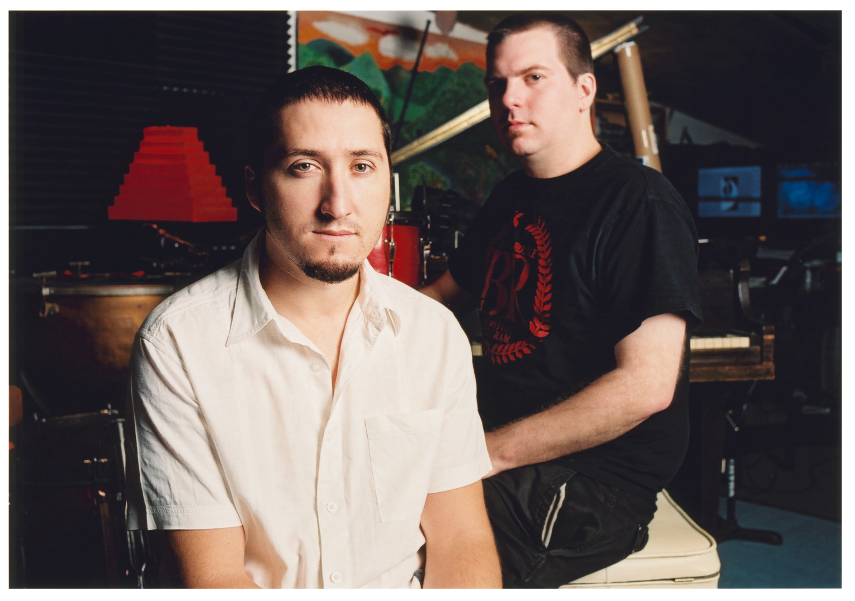 • Download Foto: Zwei Männer sitzen in einem Raum mit Musikinstrumenten. Einer trägt ein weißes Hemd, der andere ein schwarzes T-Shirt.
