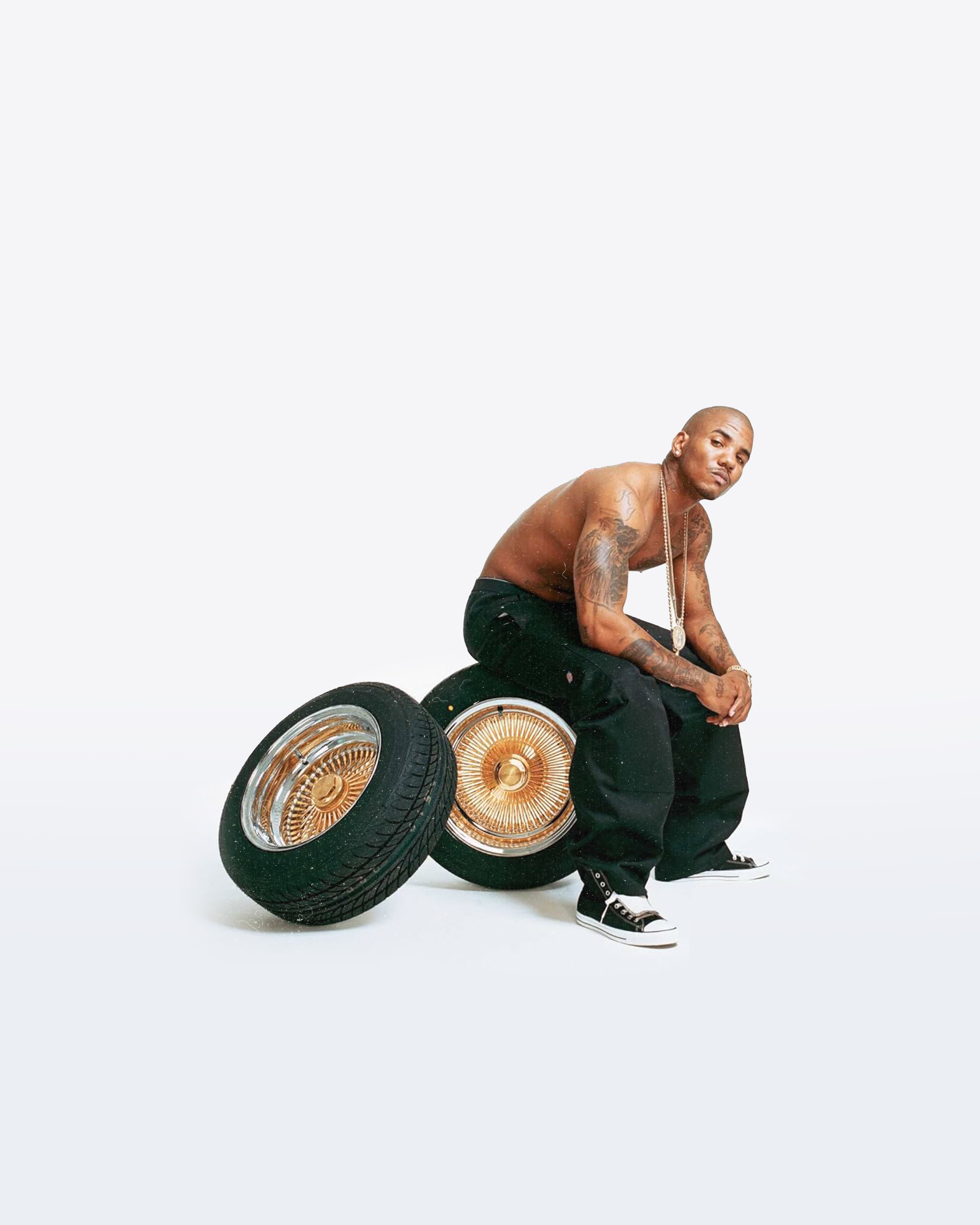 Ein tätowierter Mann sitzt mit freiem Oberkörper auf Felgen mit goldenen Speichen, vor weißem Hintergrund.