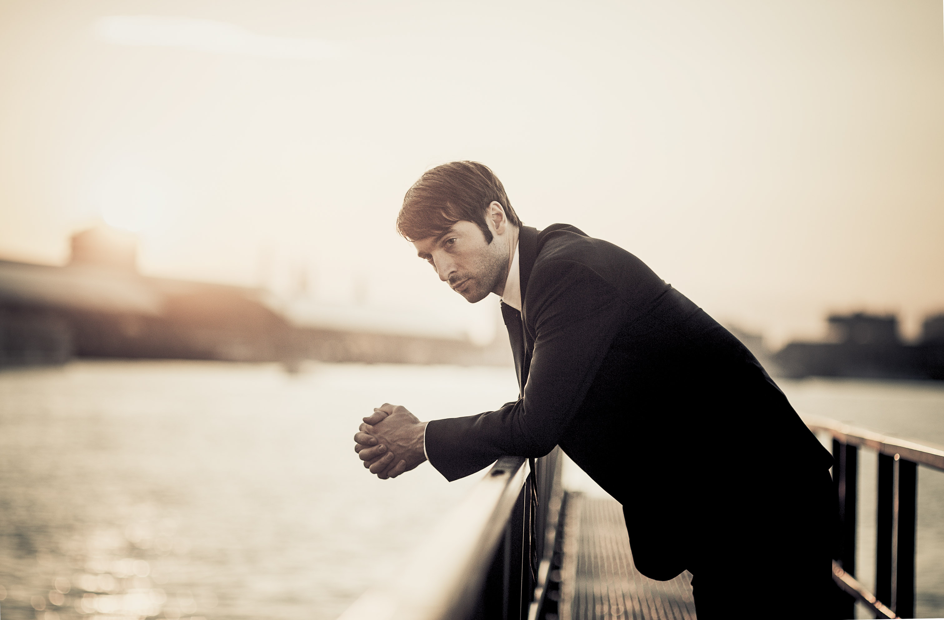 • Download Foto: Ein Mann in einem Anzug lehnt gedankenvoll an einem Geländer mit Blick auf einen Fluss bei Sonnenuntergang. Die Szene wirkt ruhig.Credit: Hans van der Woerd