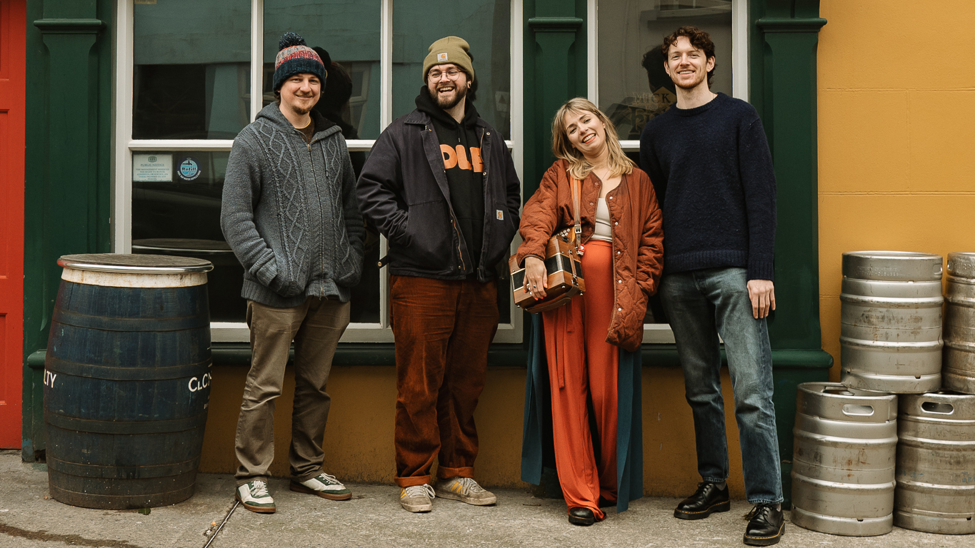• Download Foto: Vier Personen stehen vor einem Gebäude mit bunten Wänden. Links ein Fass, rechts zwei Metallfässer. Alle lächeln in die Kamera.Eva Coyle Band (Credit: Rosie Prendiville)