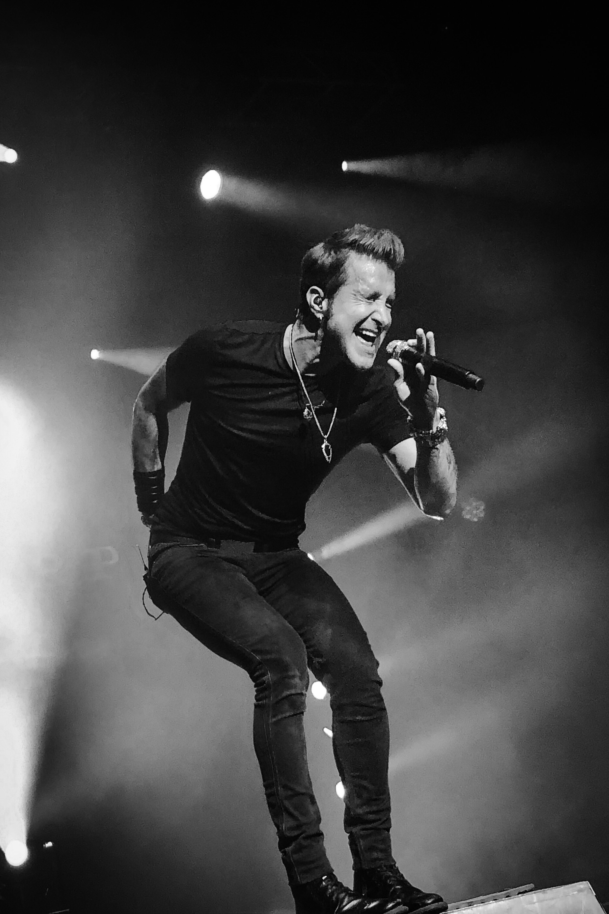 • Download Foto: Schwarz-weiß-Foto eines Sängers auf der Bühne, dynamische Pose, Mikrofon in der Hand, Scheinwerfer im Hintergrund.