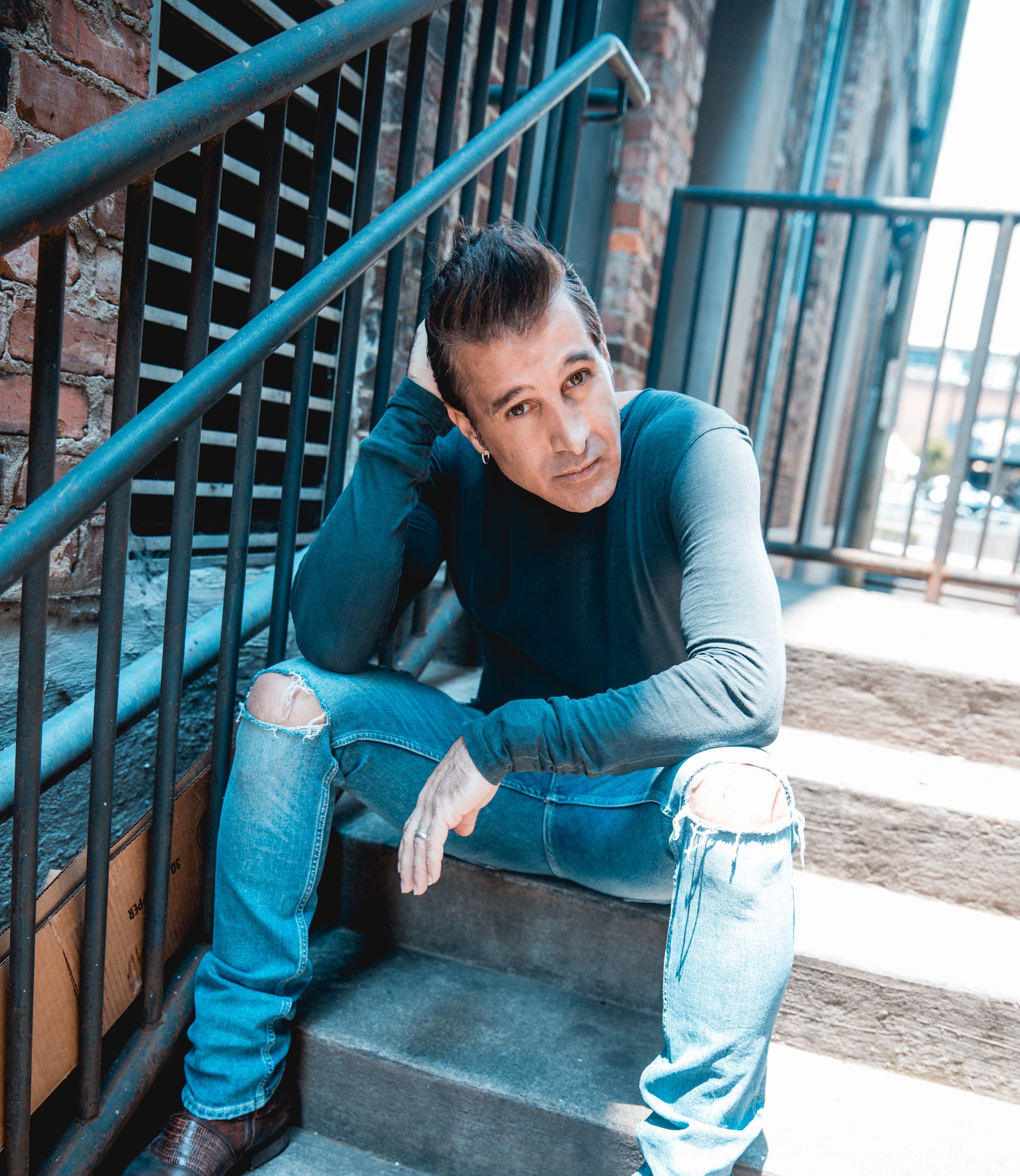 • Download Foto: Ein Mann sitzt auf Stufen neben einem Metallgeländer, trägt Jeans und ein langärmliges Oberteil und schaut nachdenklich zur Seite.credit Jenn Curtis