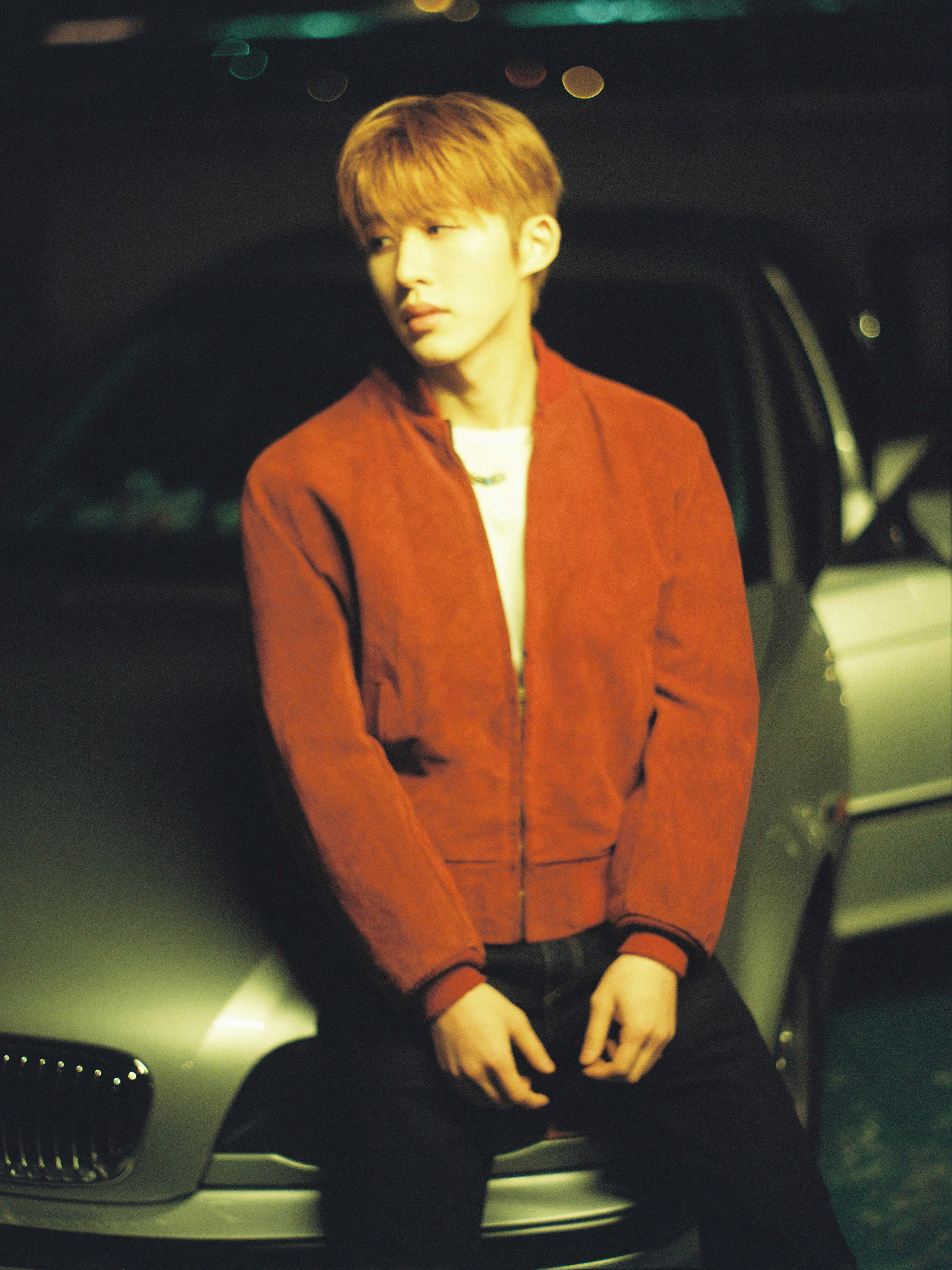 • Download Foto: Eine Person sitzt in roter Jacke auf der Motorhaube eines silbernen Autos, beleuchtet von warmem Licht.source Wasserman Music