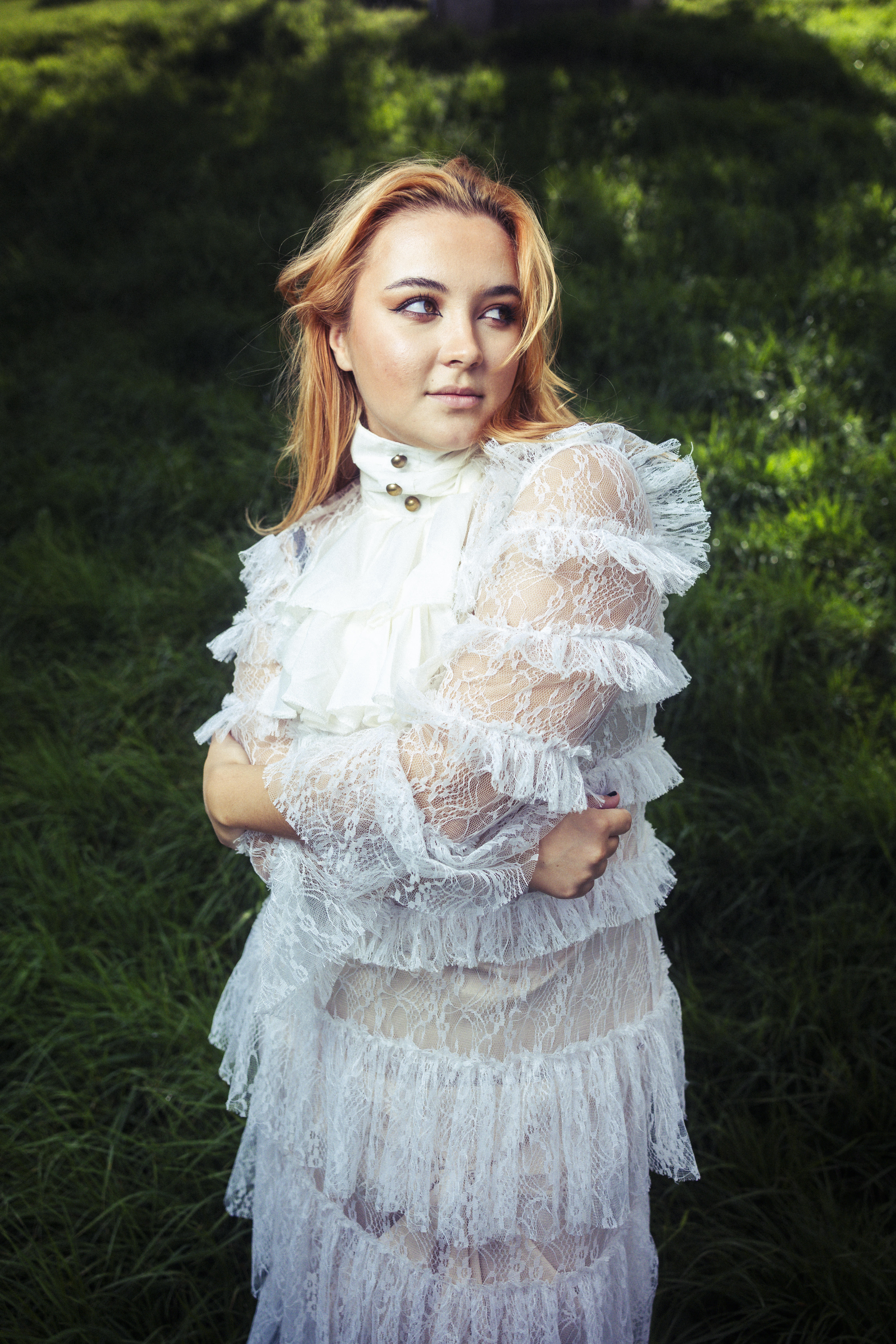 • Download Foto: Person in einem weißen, rüschigen Kleid steht im Freien, von Bäumen umgeben. Sie hat die Arme verschränkt und schaut zur Seite.Credit: Jonathan Labusch