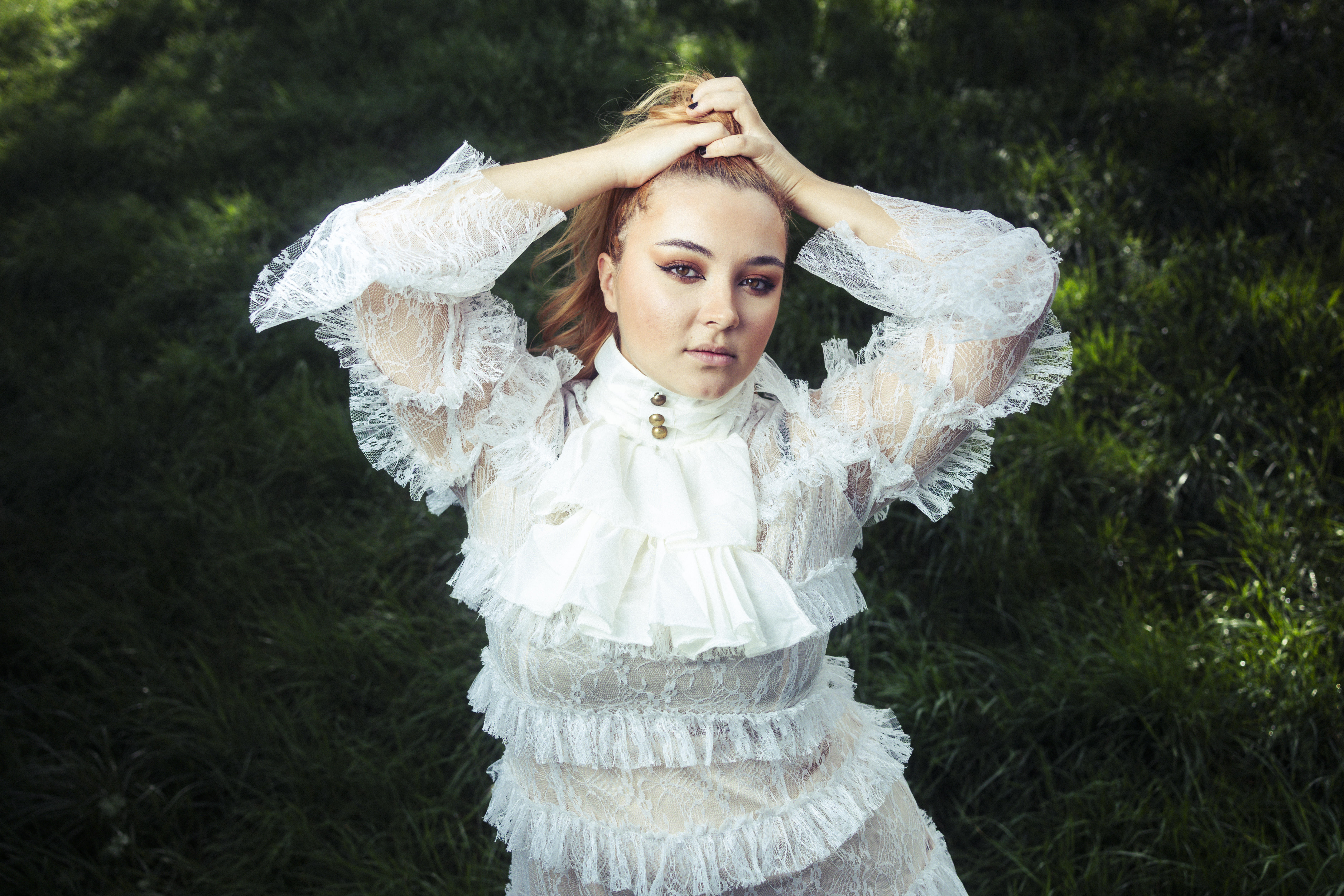 • Download Foto: Eine Person in einem weißen, rüschenbesetzten Kleid steht mit erhobenen Armen im Freien, umgeben von grünem Laubwerk.Credit: Jonathan Labusch