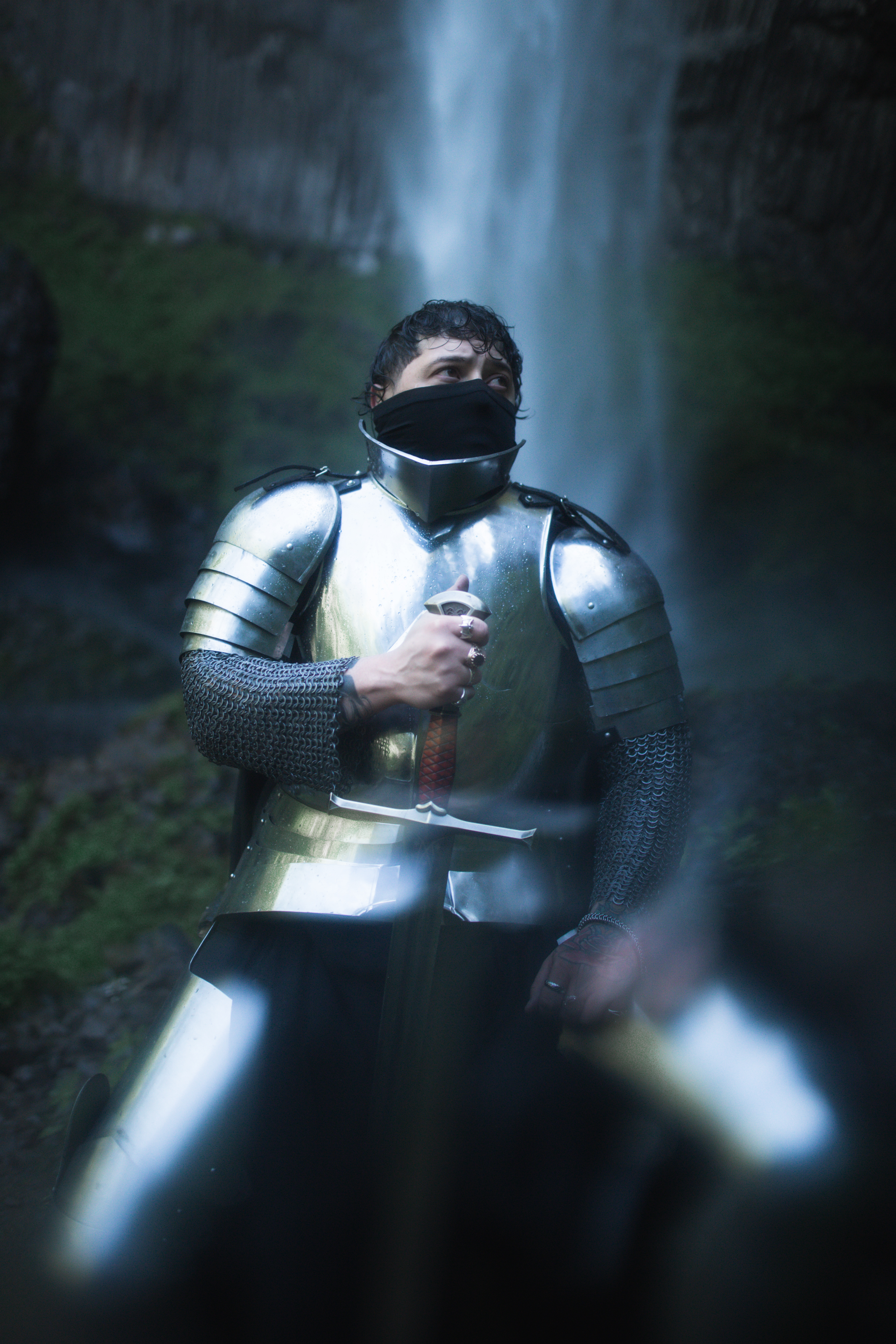 Er trägt Ritterrüstungen.