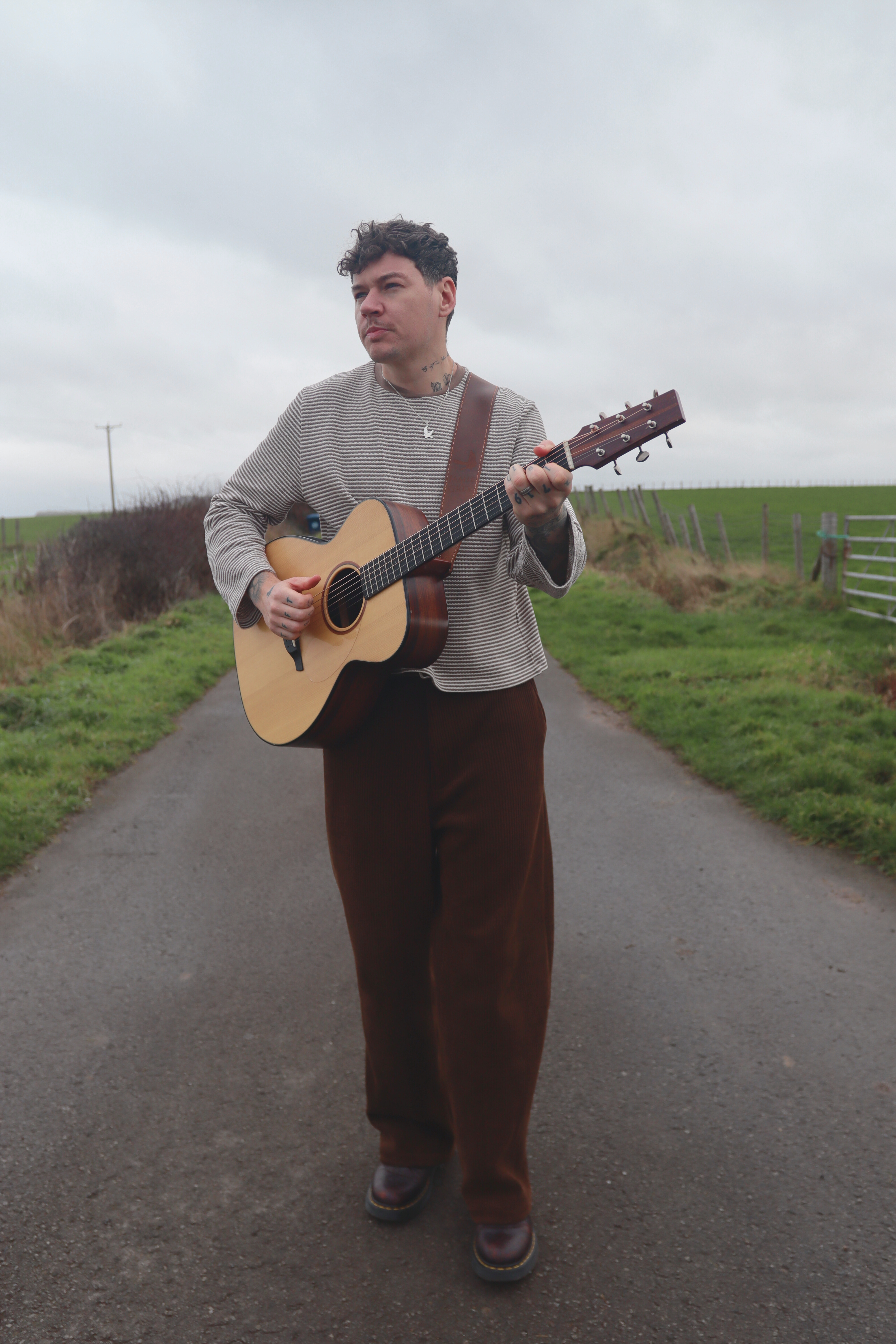 Eine Person mit Gitarre steht in einer ländlichen Umgebung, umgeben von Feldern und einem bewölkten Himmel.