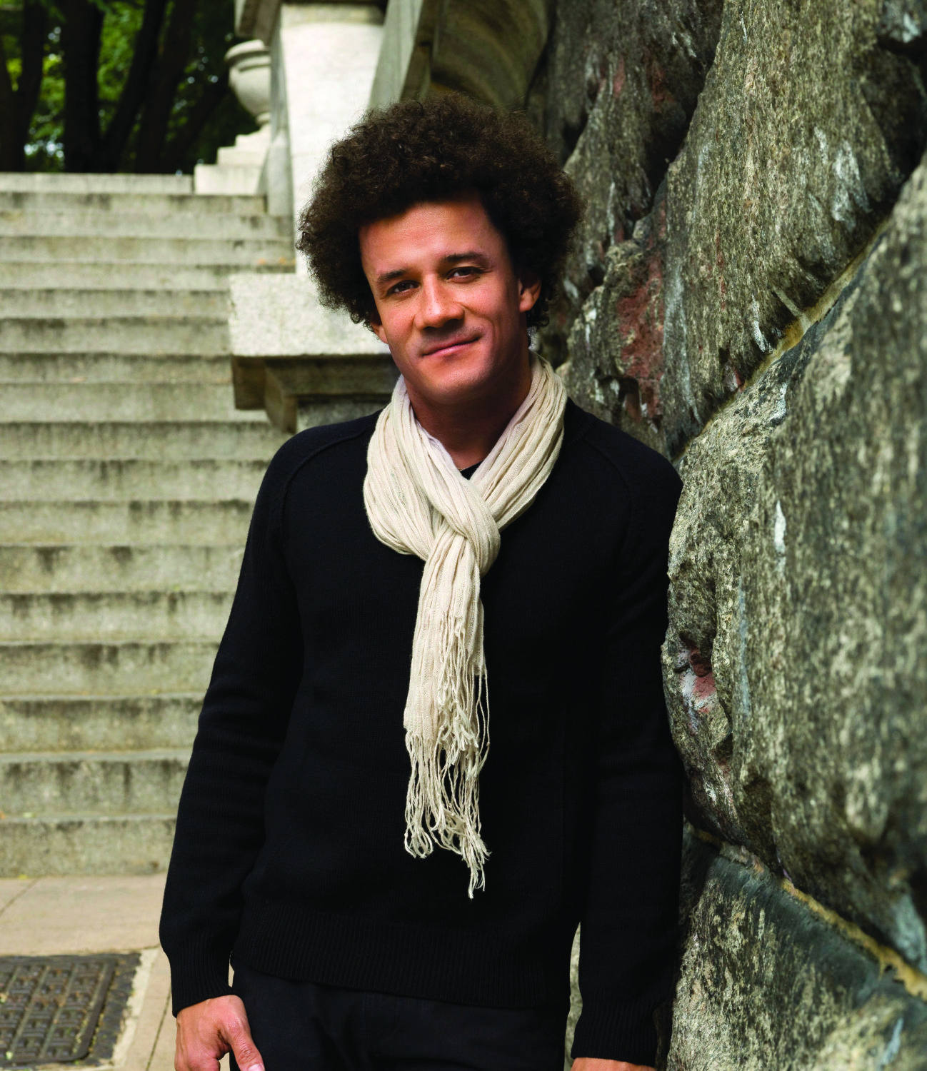 • Download Foto: Junger Mann mit Locken und Schal steht lächelnd vor einer Steintreppe und Mauer im Freien.